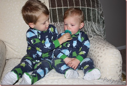 Okay, not so scary in their monster outfits, but awfully cute! The mommies decided to buy them matching pajamas so one day when they were here, we got them ready for bed and wanted to try a photo shoot. As you can see, cousin Abram was a little too tired for it and had a few tears in his eyes! Still cute!